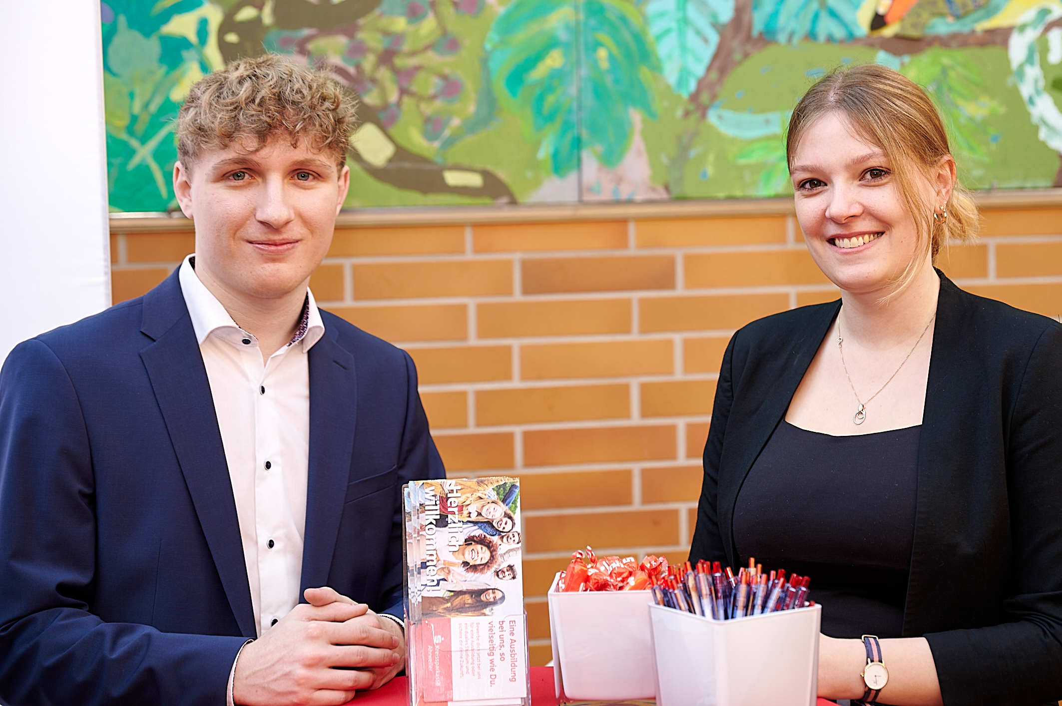 Stammgast seit Jahren: unser Patenbetrieb, die Kreissparkasse Ahrweiler, hier mit der Ausbildungsleiterin Lara Fritsche und unserem Ex-Schüler Felix Zepp – jetzt auch Auszubildender bei der KSK Ahrweiler
